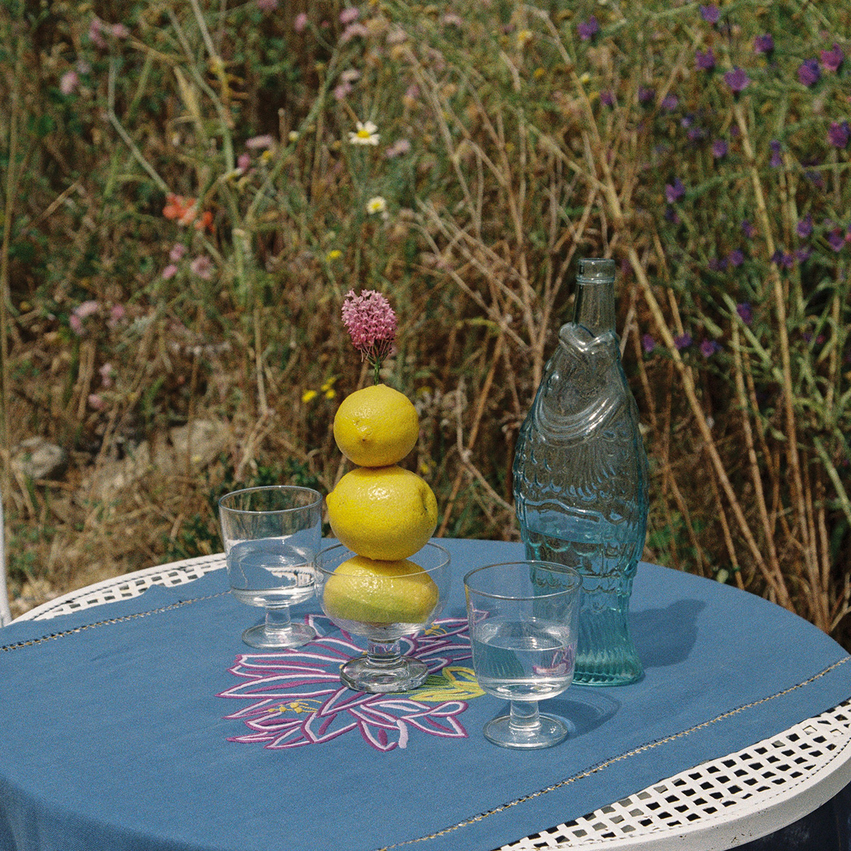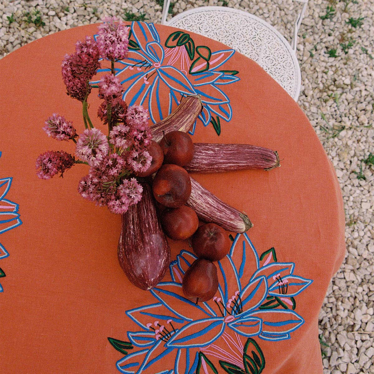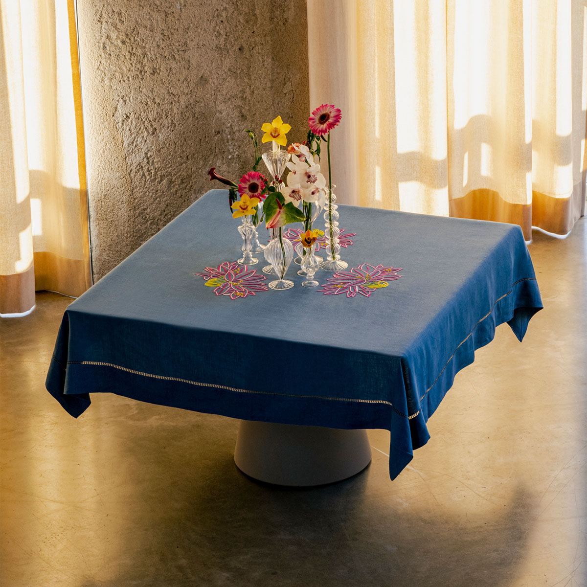 Hand-embroidered with open hems, our linen tablecloths provide the perfect backdrop for any setting. With each motif taking fourteen hours to complete, and each meter of open hem two hours to prepare, the artistry behind each design is significant. Style with contrasting-coloured ceramics and delicate floral arrangements for a chic, maximalist aesthetic.